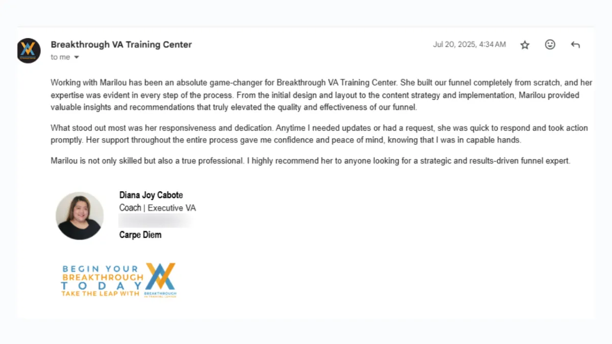 Marilou is reliable and detail-oriented. She consistently delivered quality work and made a real impact on my business. It is a pleasure working with her .